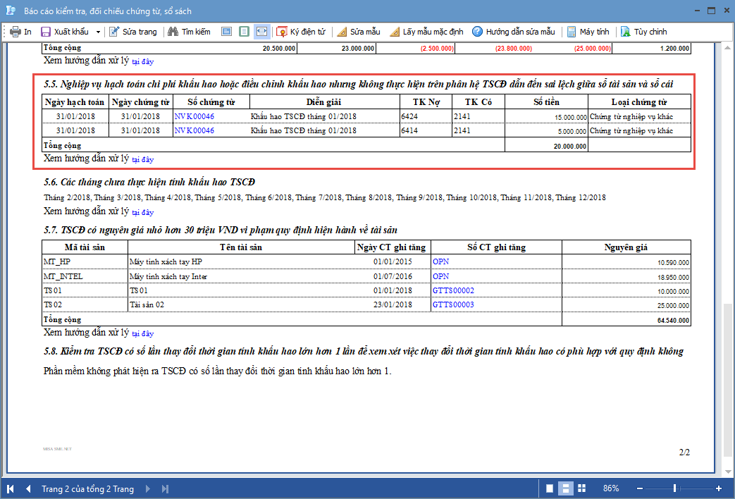Trường hợp trong kỳ có chứng từ hạch toán chi phí khấu hao hoặc điều chỉnh khấu hao nhưng không thực hiện trên phân hệ TSCĐ, chương trình sẽ hiển thị báo cáo liệt kê chi tiết các chứng từ này.
