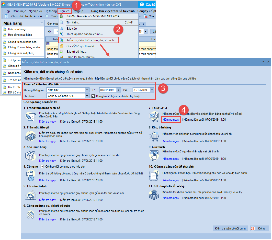 Hướng dẫn 1. Vào menu Tiện ích\Kiểm tra, đối chiếu chứng từ, sổ sách. 2. Thiết lập tham số, kiểm tra đối chiếu số liệu. 3. Tại mục 7. Thuế GTGT nhấn Kiểm tra ngay.