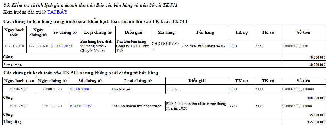 Trường hợp trong kỳ có sự chênh lệch giữa doanh số bán trên các báo cáo bán hàng như Sổ chi tiết bán hàng, Tổng hợp bán hàng…với tổng phát sinh có của TK511 trên sổ cái TK511, bảng cân đối phát sinh…: chương trình sẽ hiển thị báo cáo thể hiện thông tin các chứng từ, hóa đơn có chênh lệch.