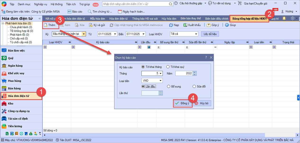Trường hợp thiếu dữ liệu hóa đơn tại bảng tổng hợp dữ liệu hóa đơn điện tử đã gửi CQT: Người bán lập và gửi bảng tổng hợp dữ liệu hóa đơn bổ sung gửi CQT. Bước 1: Vào phân hệ Hóa đơn điện tử → Bảng tổng hợp dữ liệu HĐĐT, nhấn Thêm. Bước 2: Trên form chọn kỳ báo cáo, chọn Loại HHDV và tích chọn loại báo cáo Bổ sung, nhấn Đồng ý.
