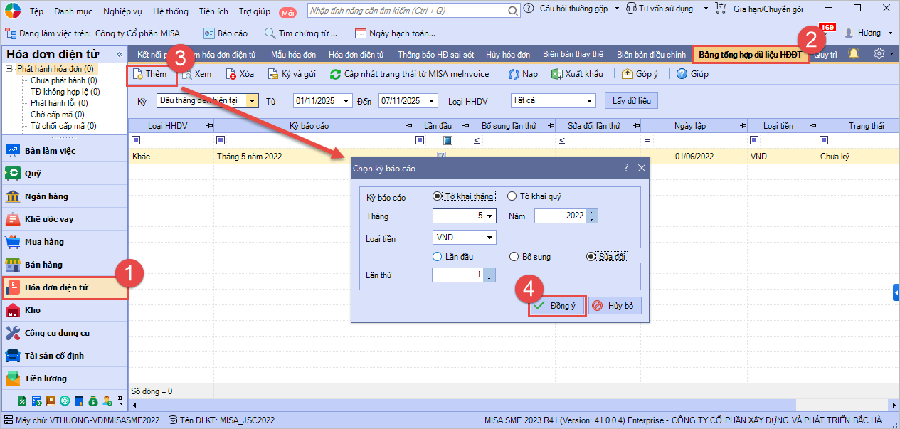 Bước 1: Vào phân hệ Hóa đơn điện tử → Bảng tổng hợp dữ liệu HĐĐT, nhấn Thêm Bước 2: Trên form chọn kỳ báo cáo, chọn Loại HHDV và tích chọn loại báo cáo Sửa đổi. Bước 3: Nhấn Đồng ý