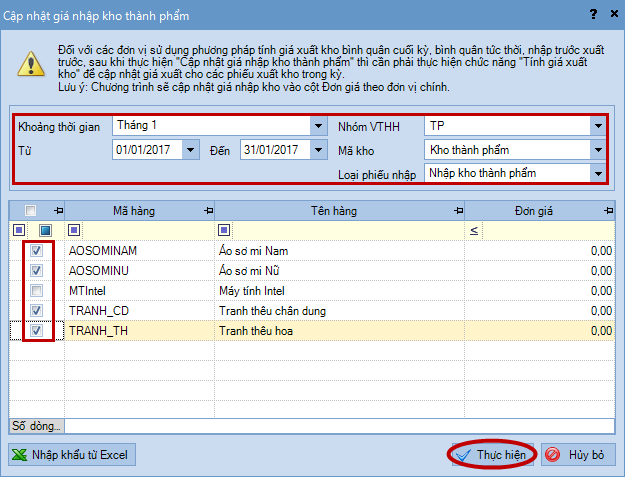 => Chương trình sẽ tự động cập nhật đơn giá và tính lại thành tiền cho các mặt hàng đã chọn trên các chứng từ nhập kho tương ứng có hạch toán Nợ TK 15x/Có TK 154 (ngoại trừ Nợ TK 154/Có TK 154). Riêng đối với nhập kho từ kiểm kê sẽ không cập nhật các chứng từ có lượng = 0.