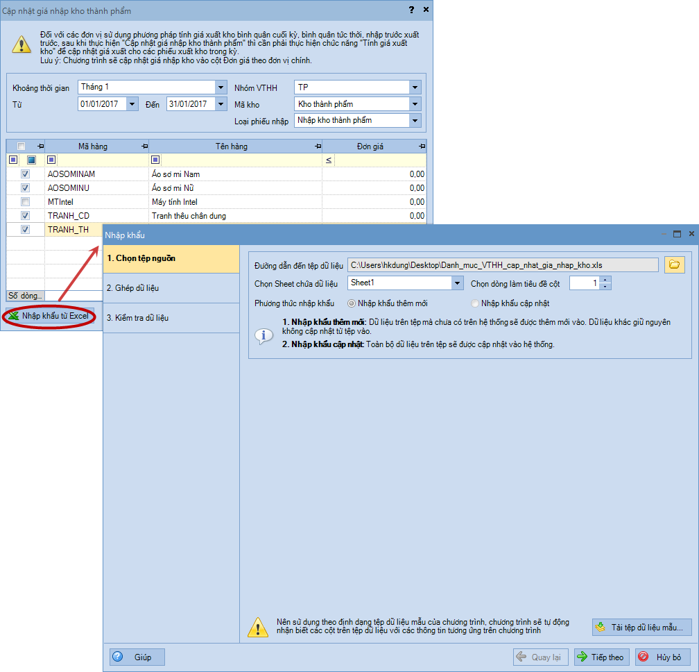 - Nhấn Nhập khẩu từ Excel để lấy đơn giá của các thành phẩm từ tệp Excel vào phần mềm. => Chi tiết hướng dẫn các bước thực hiện, xem tương tự tại đây.