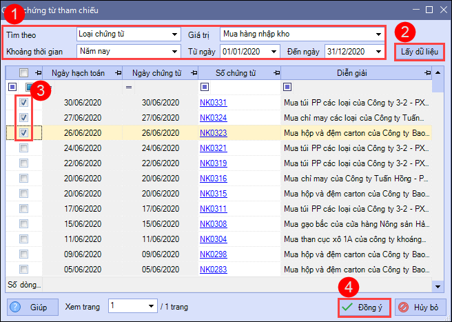 Bước 5: Sau khi chọn xong chứng từ tham chiếu, nhấn Đồng ý để lấy thông tin vừa chọn ra chứng từ đang khai báo.