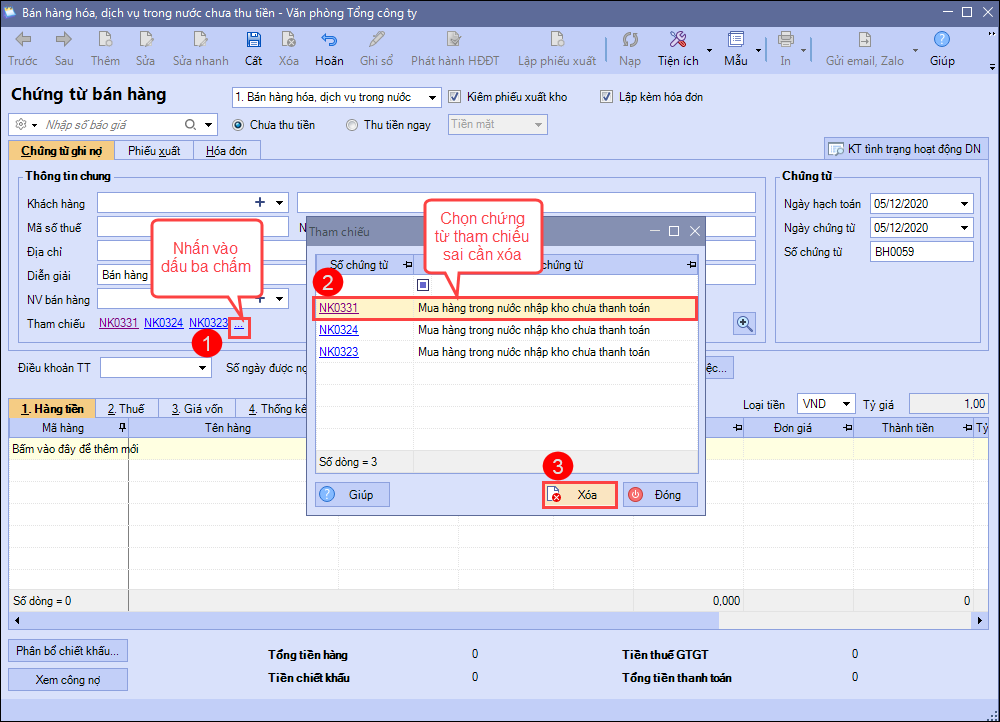 Bước 2: Xóa bỏ chứng từ tham chiếu trong trường hợp chọn sai: Nhấn vào dấu 3 chấm tại mục Tham chiếu, sau đó chọn chứng từ tham chiếu sai cần xóa và bấm Xóa