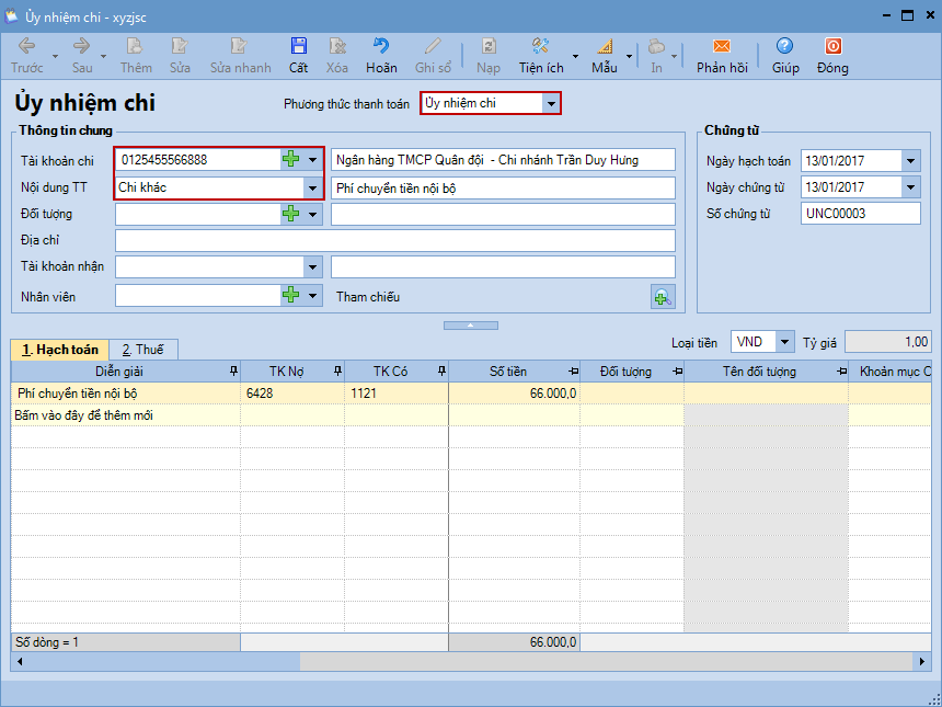 Bước 3. Nhấn Cất. 3.2 Hạch toán phí chuyển tiền (nếu có)Bước 1. Vào phân hệ Ngân hàng, chọn Chi tiền (hoặc vào tab Thu, chi tiền, nhấn Thêm\Chi tiền). Bước 2. Chọn phương thức thanh toán. Bước 3. Khai báo các thông tin chi tiết của chứng từ chi tiền.