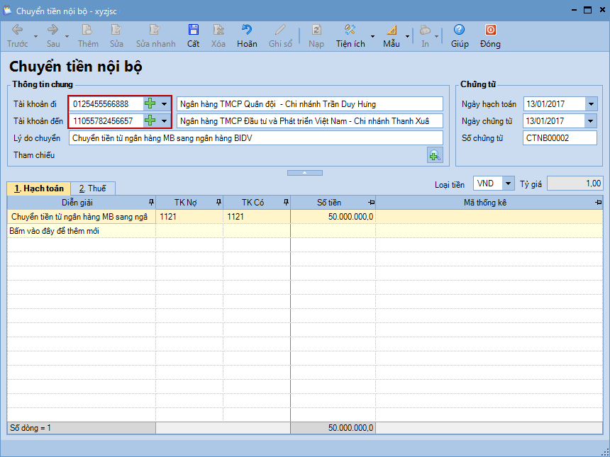 3.1 Hạch toán chứng từ chuyển tiền nội bộBước 1. Vào phân hệ Ngân hàng, chọn Chuyển tiền nội bộ (hoặc vào tab Thu, chi tiền, nhấn Thêm\Chuyển tiền nội bộ). Bước 2. Khai báo các thông tin chi tiết của chứng từ chuyển tiền nội bộ.