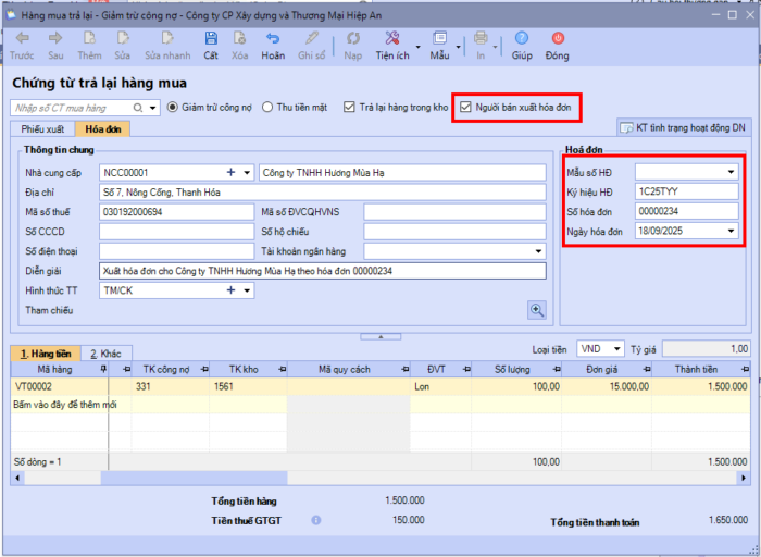 Cách thực hiện: Lập chứng từ trả lại hàng mua với các thông tin như sau:
