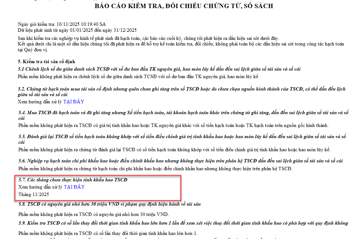 Trường hợp trong kỳ có tháng chưa thực hiện tính khấu hao TSCĐ, chương trình sẽ hiển thị báo cáo liệt kê chi tiết các tháng này.