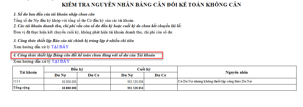 Mục đích: Hướng dẫn cách kiểm tra và xử lý nguyên nhân báo cáo tài chính không cân do công thức thiết lập chưa đúng với số dư tài khoản.