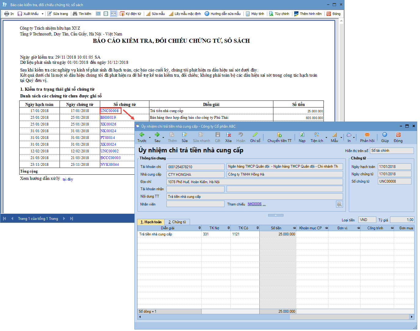 2.2 Cách xử lýBước 1: Tại giao diện Báo cáo kiểm tra, đối chiếu chứng từ, sổ sách\ mục 1. Kiểm tra trạng thái ghi sổ chứng từ, nhấn vào từng số chứng từ để mở chứng từ lên kiểm tra