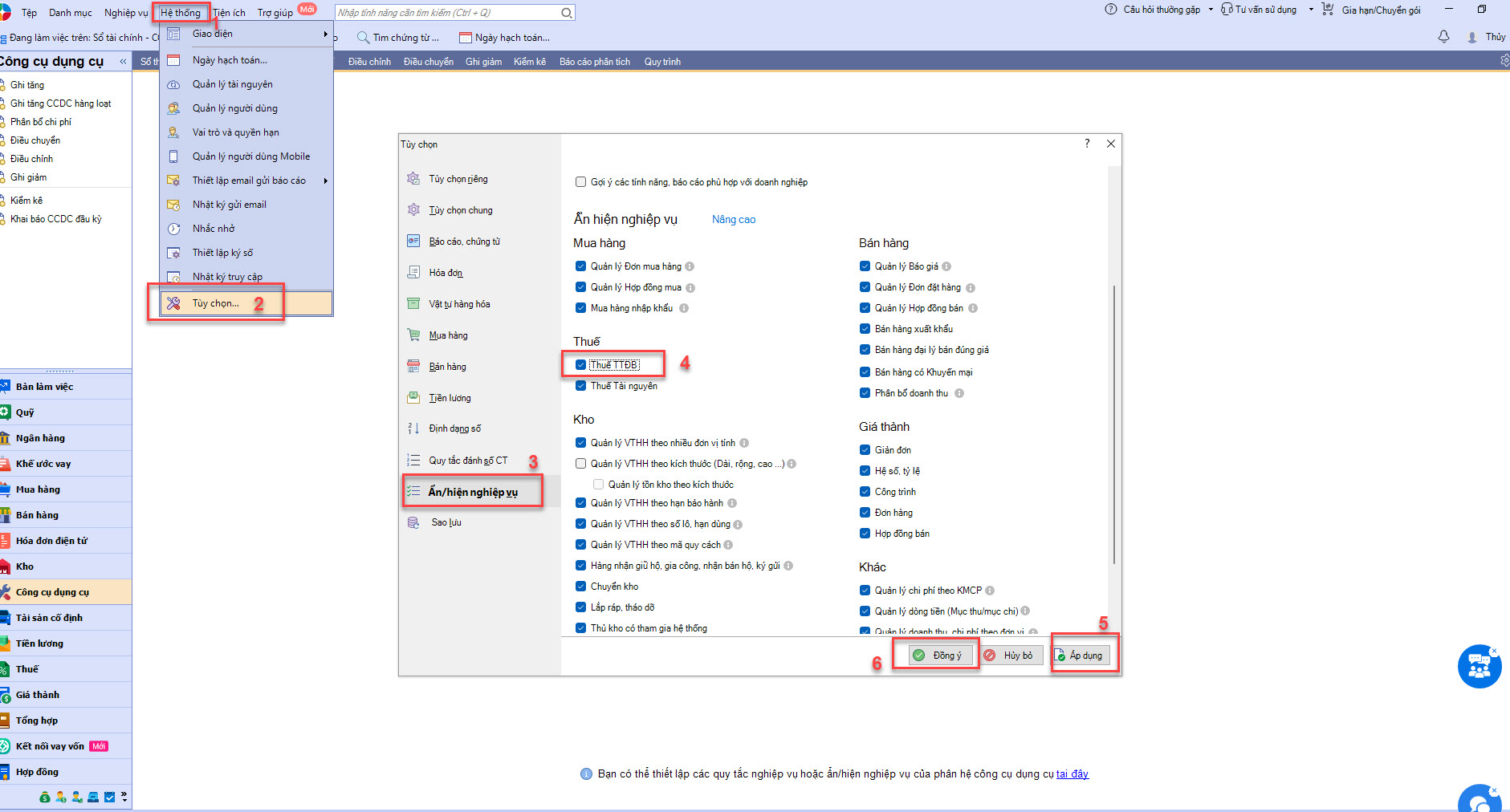 Lưu ý: Để thực hiện nghiệp vụ này, Anh/Chị vào menu Hệ thống\Tùy chọn\Ẩn hiện nghiệp vụ\Thuế, tích chọn Thuế TTĐB , nhấn Áp dụng sau đó nhấn Đồng ý.