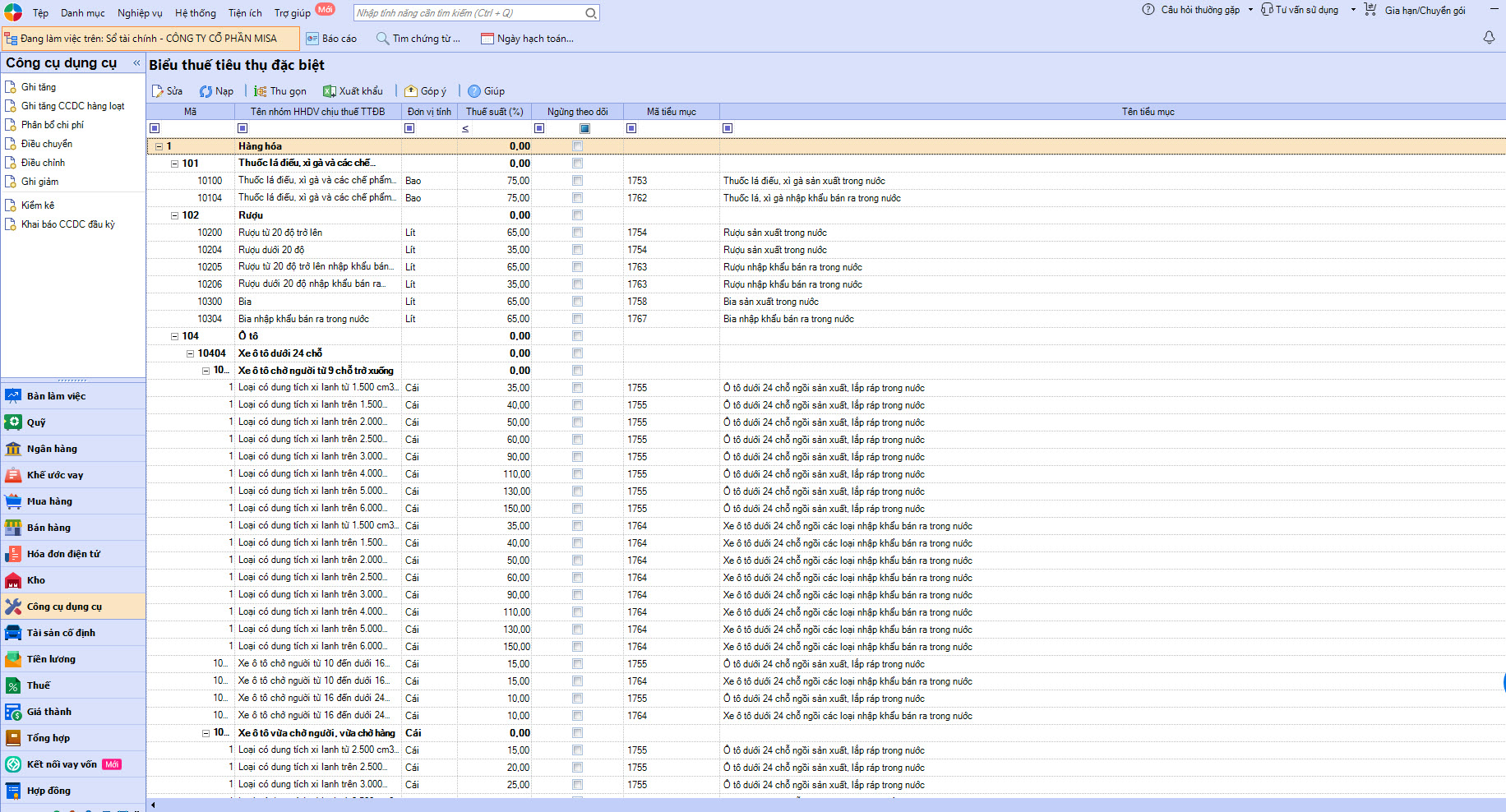 Mục đích: Bài viết này giúp kế toán quản lý, cập nhật và điều chỉnh danh sách nhóm hàng hóa, dịch vụ chịu thuế tiêu thụ đặc biệt theo quy định, phục vụ cho việc thống kê, lập bảng kê và tờ khai thuế trên phần mềm kế toán.