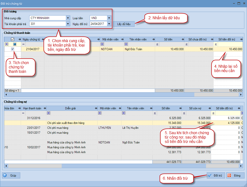 - Hướng dẫn các bước thực hiện đối trừ chứng từ