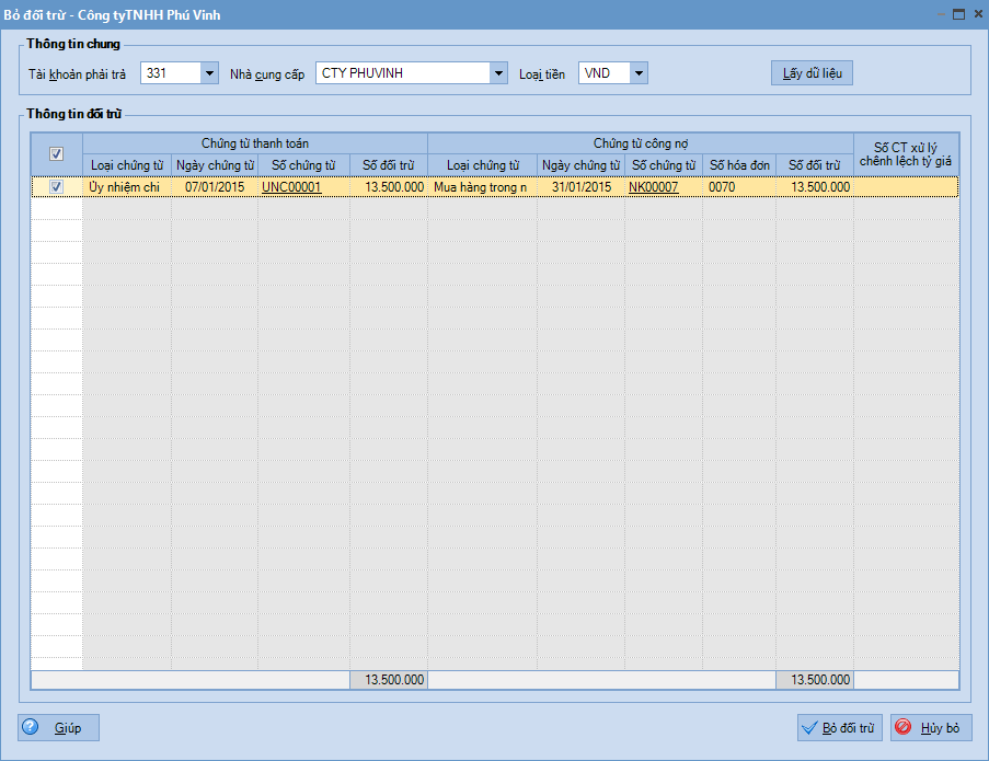 Với những lần đối trừ chứng từ có phát sinh chứng từ xử lý chênh lệch tỷ giá, để thực hiện được chức năng Bỏ đối trừ, cần phải xoá chứng từ xử lý chênh lệch tỷ giá trước.