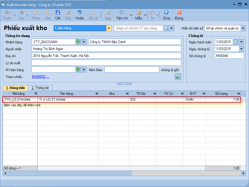 - Chọn mặt hàng, nhập số lượng xuất bán và hoàn thiện phiếu xuất kho.