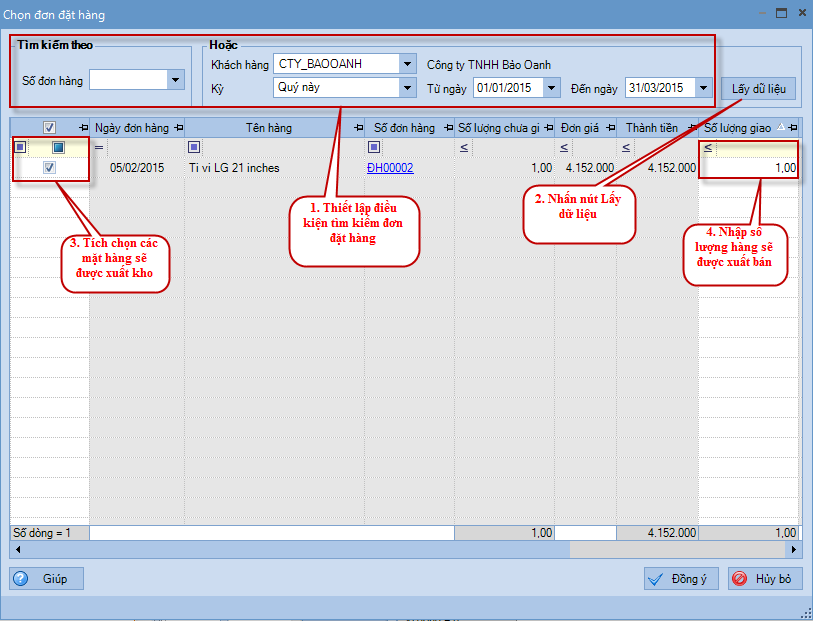- Thiết lập điều kiện tìm kiếm đơn đặt hàng.