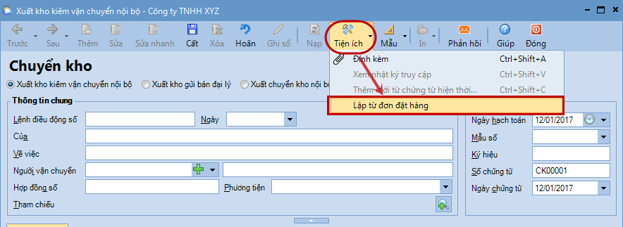 Bước 1. Khi khai báo mới một chứng từ chuyển kho, vào Tiện ích\Lập từ đơn đặt hàng.