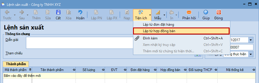 Bước 1: Khi khai báo mới một lệnh sản xuất, chọn chức năng Tiện ích\Lập từ Hợp đồng bán.