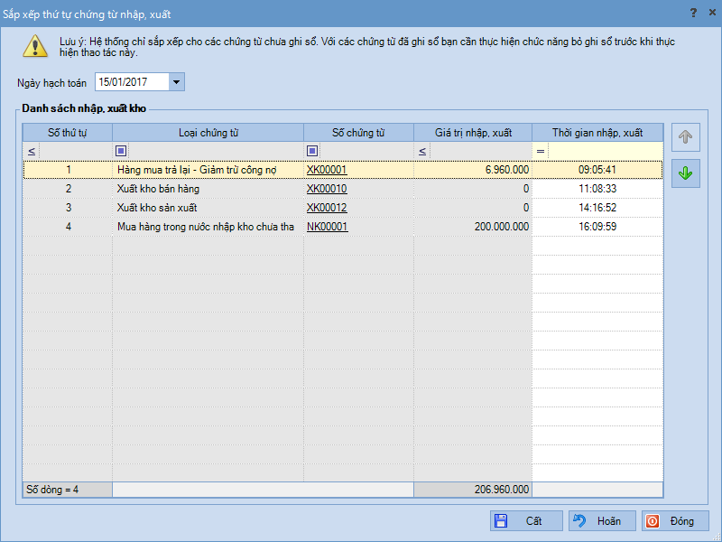 Bước 3: Chọn chứng từ nhập, xuất kho cần thay đổi, sau đó nhấn chọn vào mũi tên lên, xuống để thay đổi thứ tự của chứng từ trên danh sách.