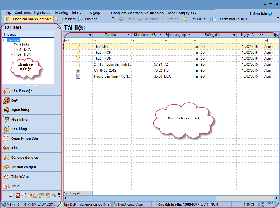 - Thanh tác nghiệp: Hiển thị cây thư mục chứa tài liệu của doanh nghiệp, đồng thời hiển thị thông tin chi tiết của thư mục hiện thời.
