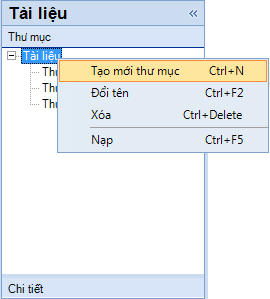 - Để tạo mới thư mục tài liệu, tại cây tài liệu bên thanh tác nghiệp, nhấn chuột phải và chọn Tạo mới thư mục hoặc nhấn tổ hợp phím Ctrl + N.