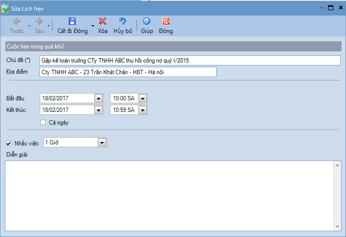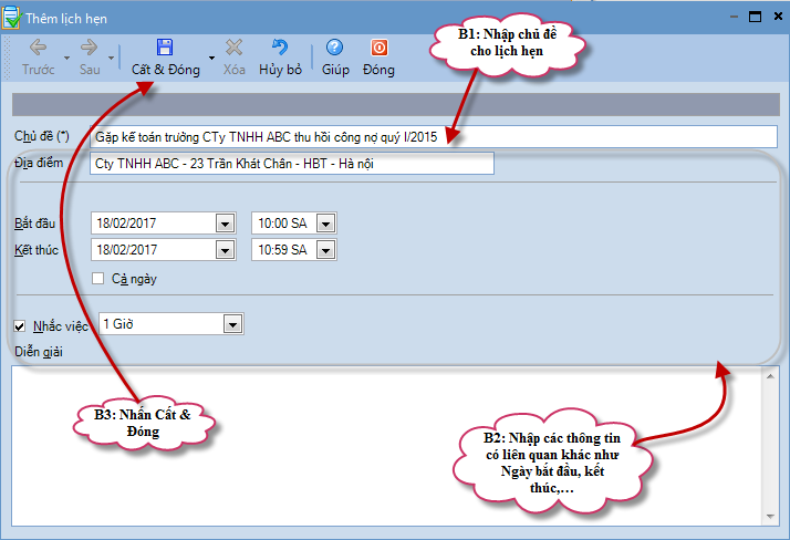 Bước 4: Khai báo các thông tin Chủ đề, Ngày bắt đầu, Kết thúc… Nhấn Cất & Đóng.