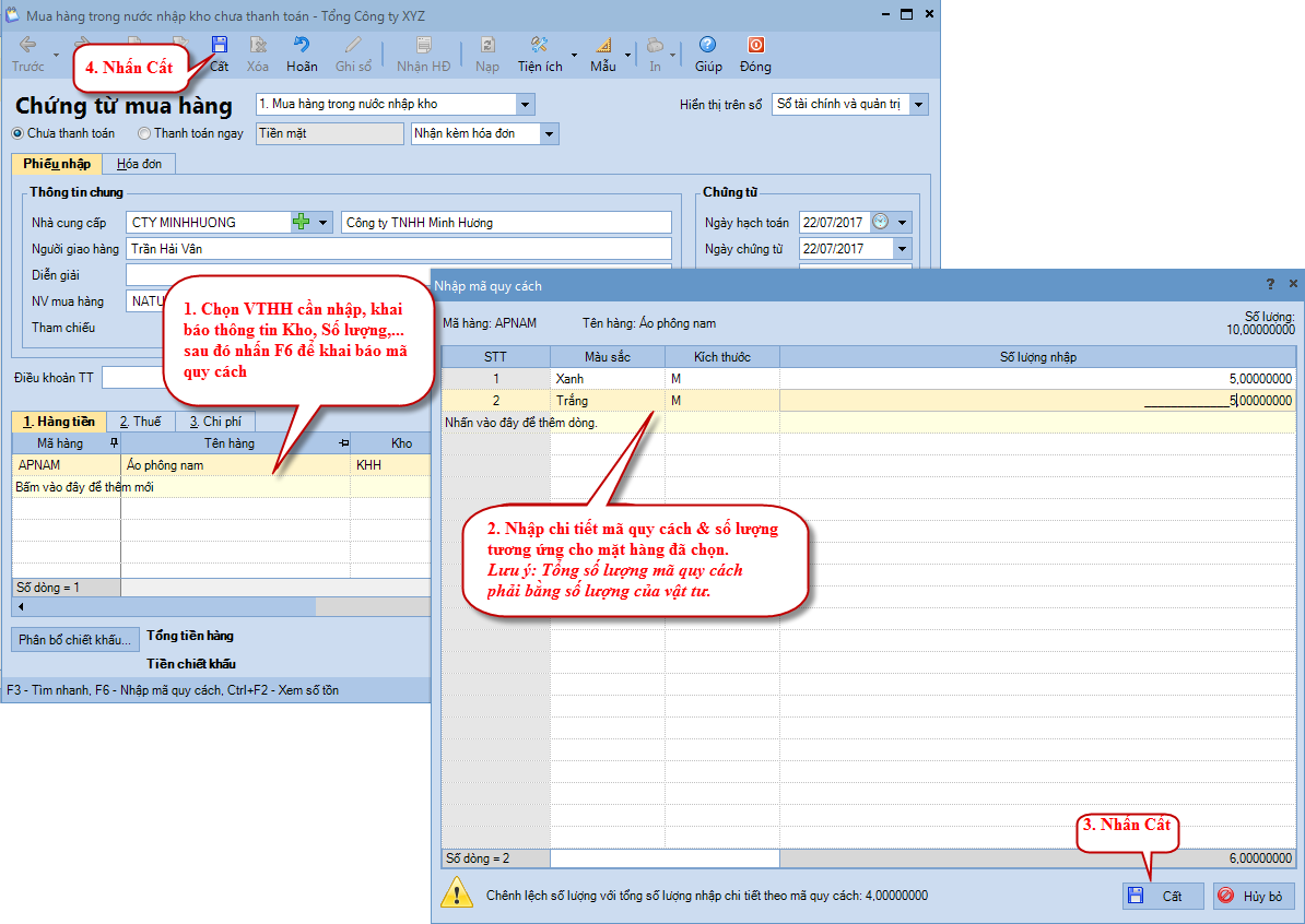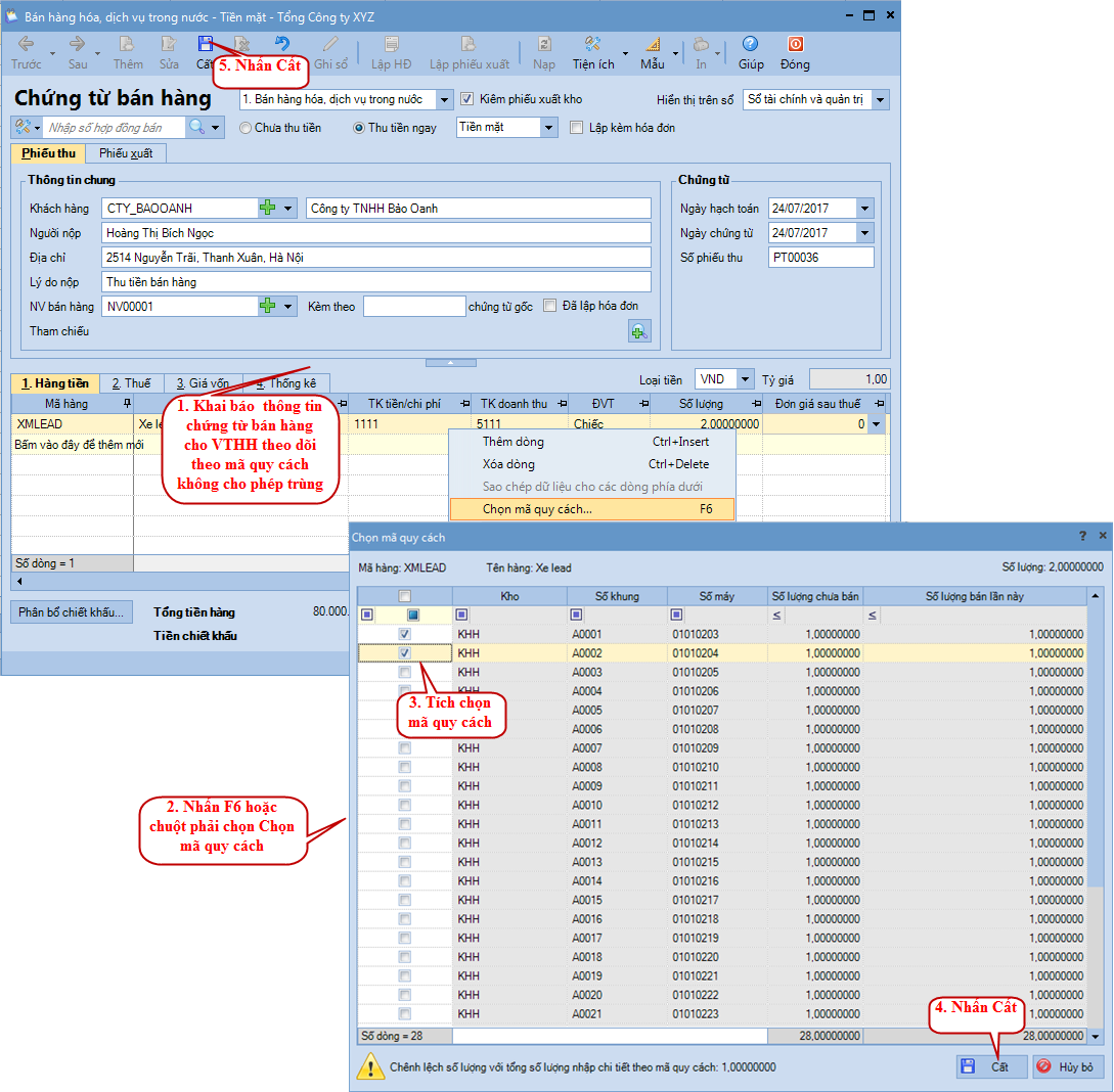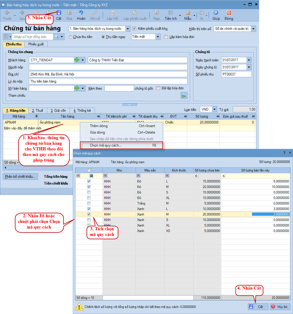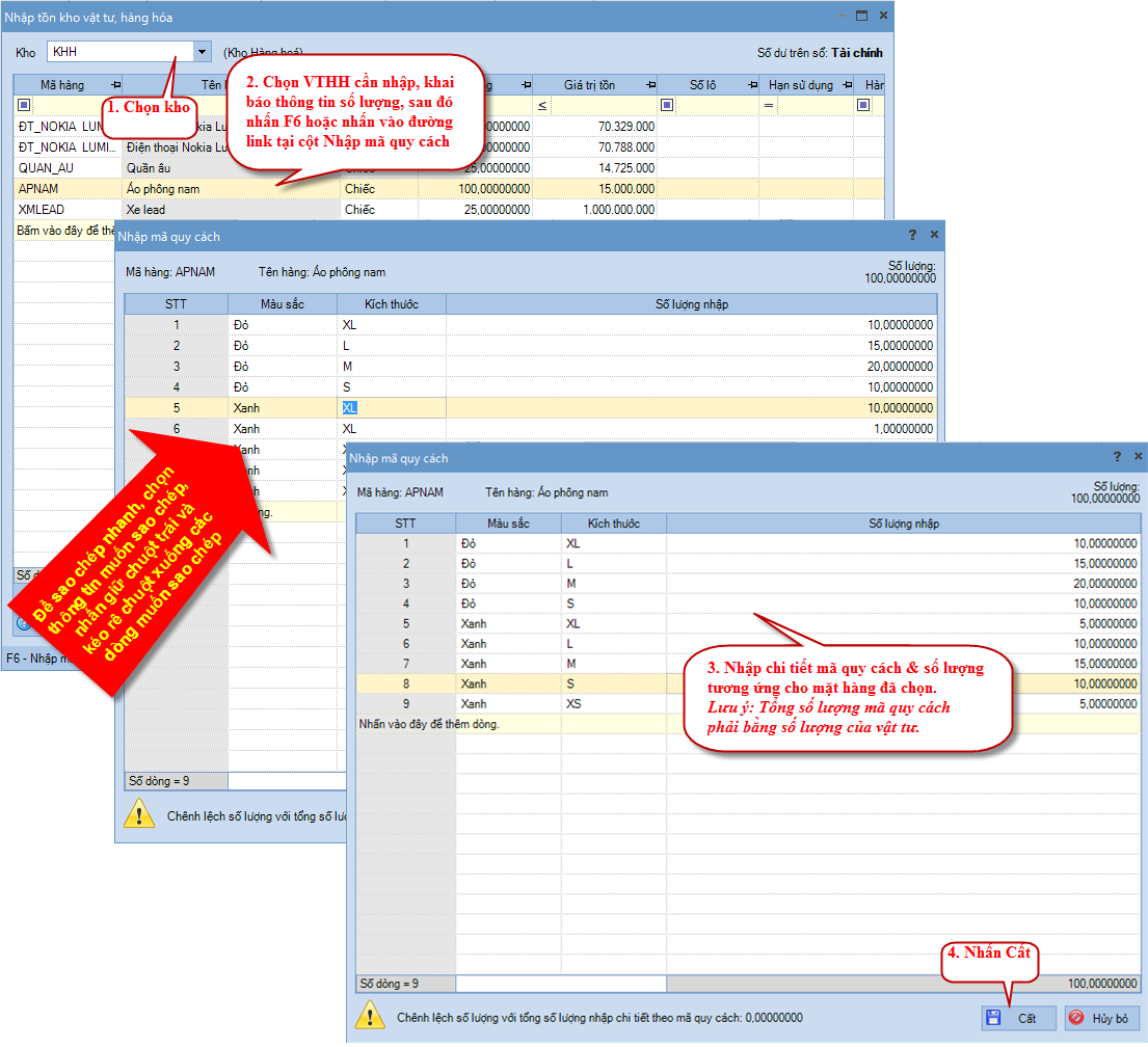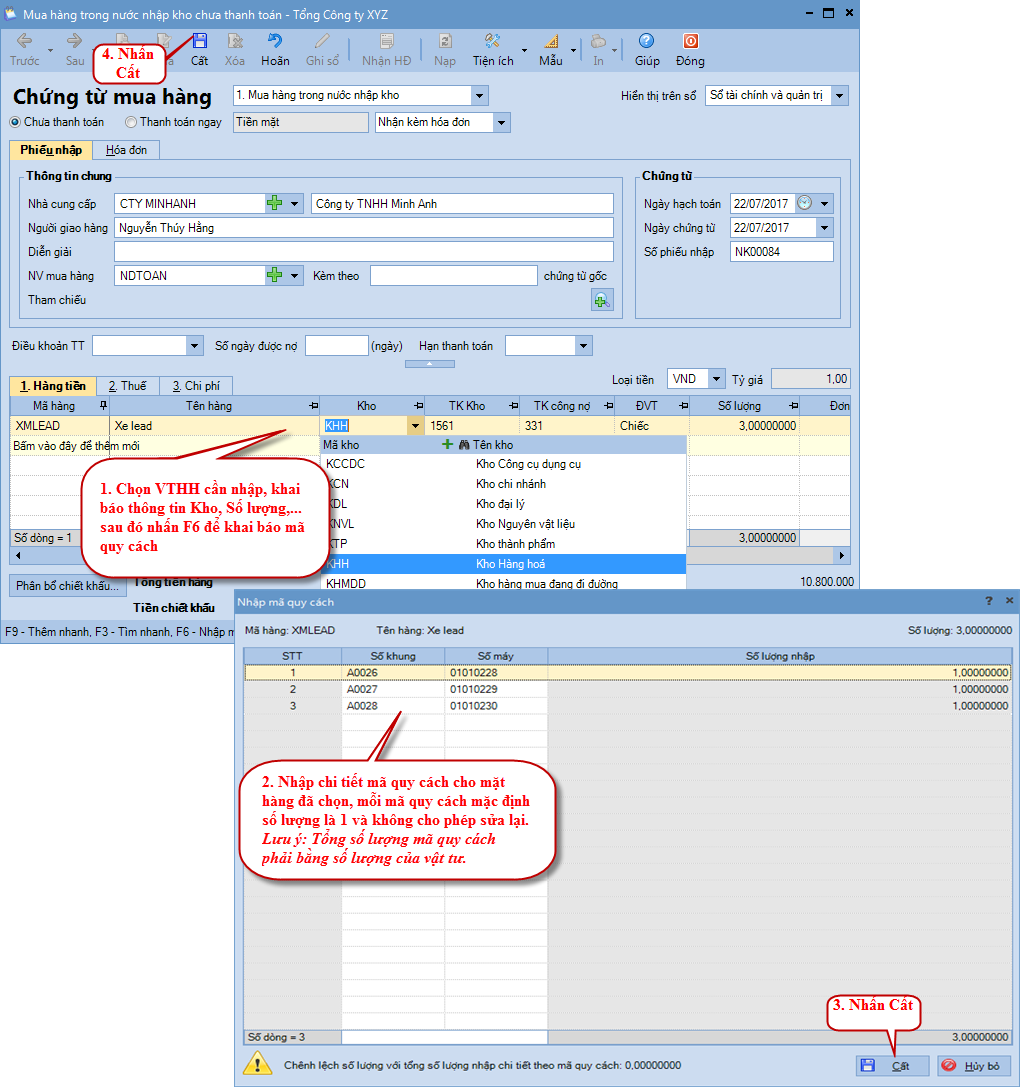 - Các bước khai báo vật tư hàng hóa, nhập số dư, nhập chứng từ phát sinh, in chứng từ và xem báo cáo theo mã quy cách.
