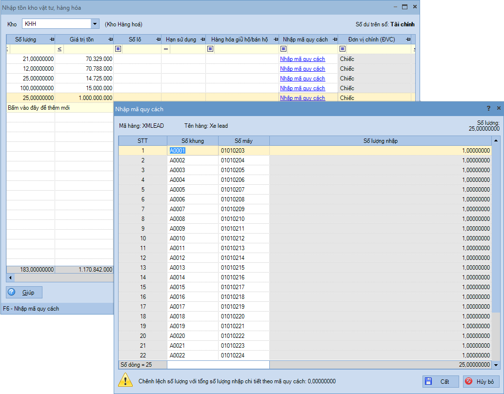 Bước 1: Vào menu Nghiệp vụ\Nhập số dư ban đầu, tab Tồn kho vật tư hàng hóa, nhấn Nhập số dư để khai báo số dư tồn ban đầu của vật tư hàng hóa. ![]() Bước 2: Tương tự nhập số dư ban đầu cho mặt hàng xe máy lead không cho phép trùng mã quy cách. 2.3 Nhập chứng từ phát sinh