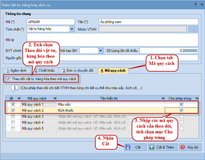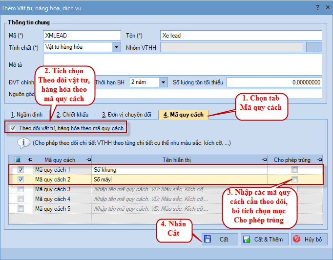 - Phân biệt mã quy cách cho phép trùng và không trùng.
