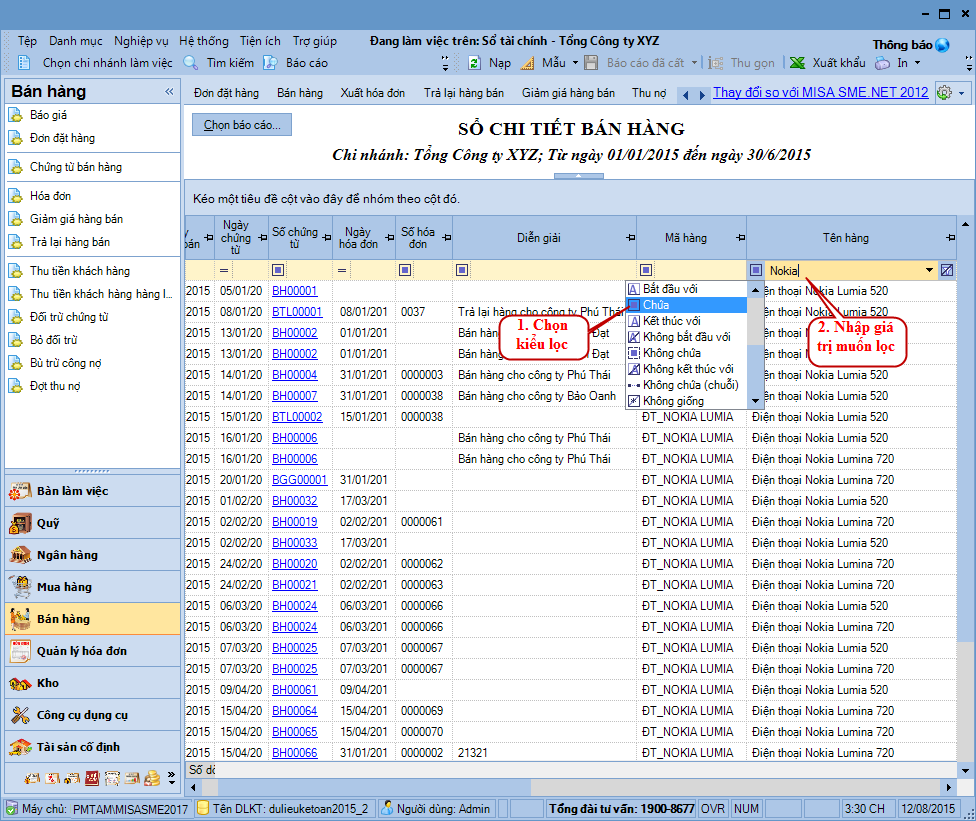 Bước 2: Trong khung lọc của từng cột phía bên phải là dấu mũi tên nhấn vào để xổ ra các nội dung có trong cột đang lọc hoặc có thể đánh tay nội dung cần lọc vào giữa khung lọc. Nội dung lọc sẽ kết hợp với điều kiện lọc để hiển thị thông tin trên báo cáo.