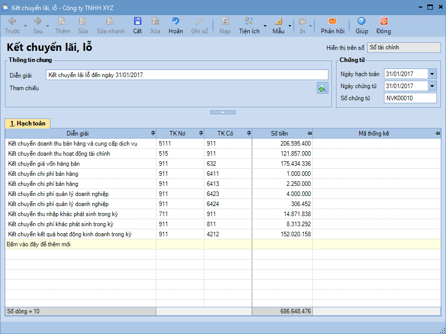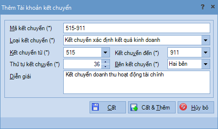 Bước 1: Vào Danh mục\Tài khoản\Tài khoản kết chuyển, chọn chức năng Thêm. ![]() Bước 2: Khai báo cặp tài khoản kết chuyển, sau đó nhấn Cất. Lưu ý: Hệ thống đã xây dựng sẵn hệ thống các cặp tài khoản kết chuyển, kế toán có thể khai báo bổ sung hoặc sửa đổi các cặp tài khoản kết chuyển đã có phù hợp với yêu cầu quản lý của doanh nghiệp. 3.2. Thực hiện kết chuyển lãi lỗ kinh doanh cuối kỳ