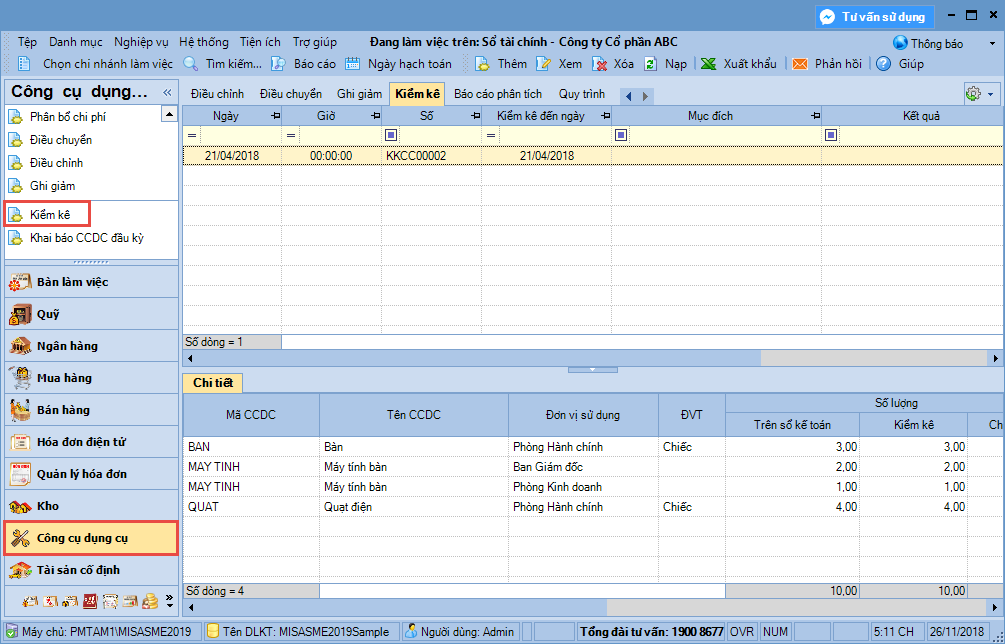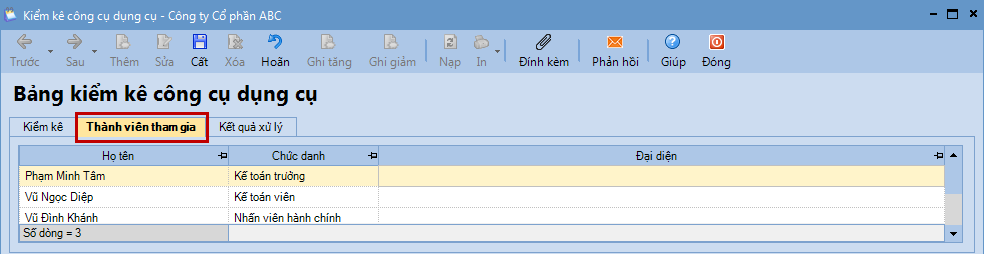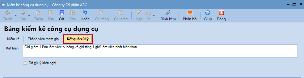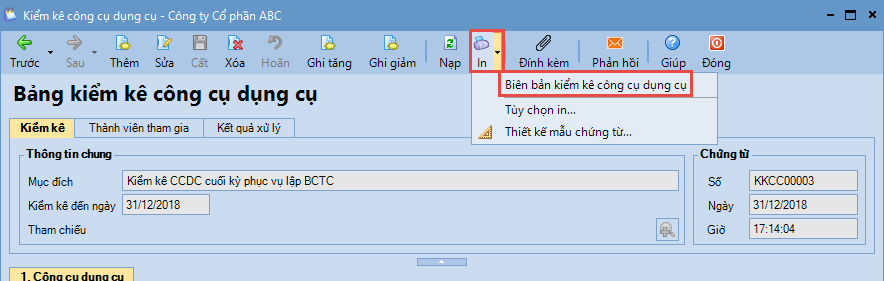Bước 4: Nhấn Cất. Bước 5: Nhấn In để in Biên bản kiểm kê công cụ dụng cụ, sau đó chuyển cho các đối tượng có liên quan ký xác nhận và lưu trữ lại theo quy định.