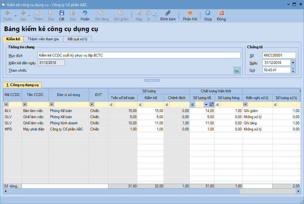 3.4 Tổng hợp kết quả kiểm kêSau khi thực hiện kiểm kê tất cả các tài sản, nguồn vốn trong đơn vị theo quy định, kế toán tổng hợp toàn bộ kết quả kiểm kê tài sản, nguồn vốn của doanh nghiệp (bao gồm kết quả kiểm kê CCDC) vào Báo cáo tổng hợp kết quả kiểm kê. |