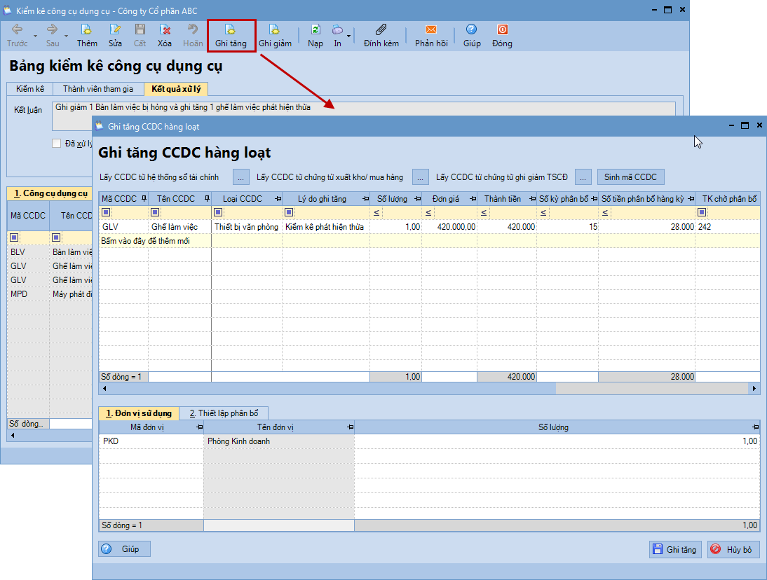 Ghi nhận CCDC thừa sau kiểm kê theo giá trị hợp lý của CCDC tại thời điểm phát hiện
