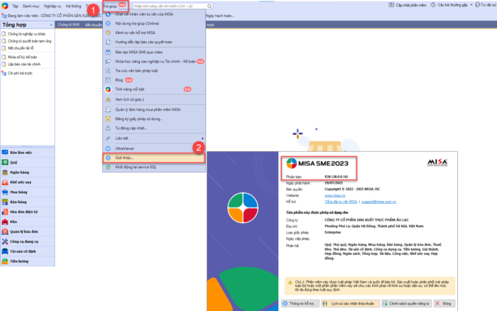 - Cách xem phiên bản: Vào mục Trợ giúp\Giới thiệu\xem dòng sản phẩm và phiên bản R (Ví dụ như hình dưới là dòng MISA SME 2023 và phiên bản R38)