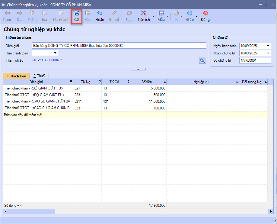 Cho phép lập Chứng từ nghiệp vụ khác từ Hóa đơn chiết khấu trên MISA SME nhanh chóng và chính xác.