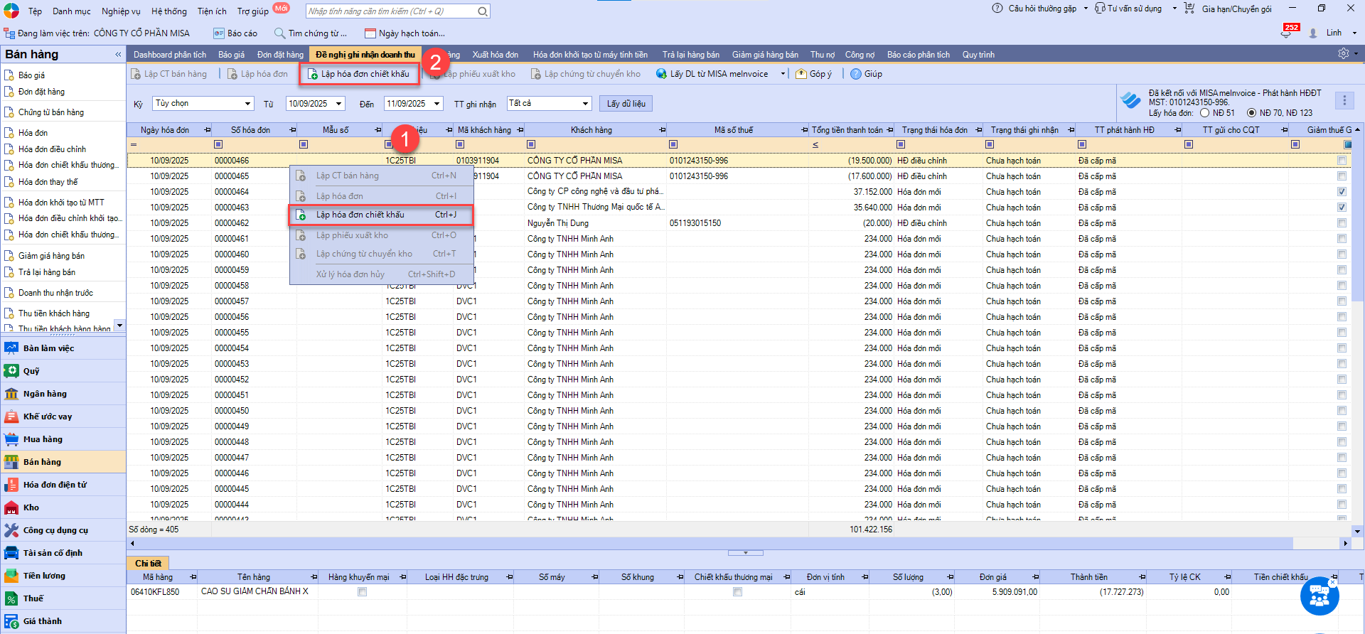 2. Chọn Lập hóa đơn chiết khấu trên thanh chức năng (Hoặc nhấn chuột phải, chọn Lập hóa đơn chiết khấu).