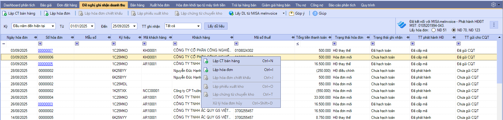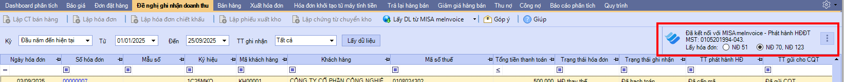 Bước 1: Sau khi kết nối TK meInvoice, tại phân hệ Bán hàng\tab Đề nghị ghi nhận doanh thu, tích chọn lấy hóa đơn theo NĐ70, NĐ123 và nhấn Lấy DL từ MISA meInvoice.
