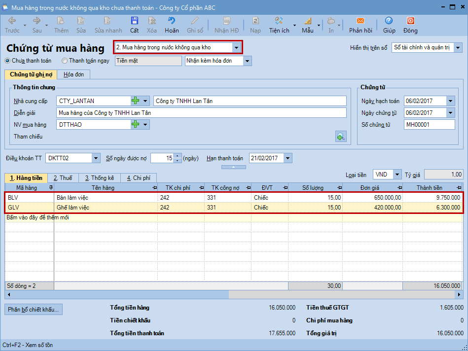 Nghiệp vụ “Mua sắm công cụ, dụng cụ đưa vào sử dụng” được thực hiện trên phần mềm theo một trong hai trường hợp sau: