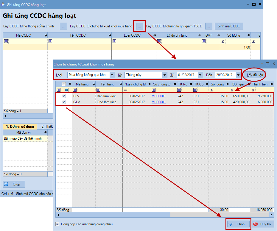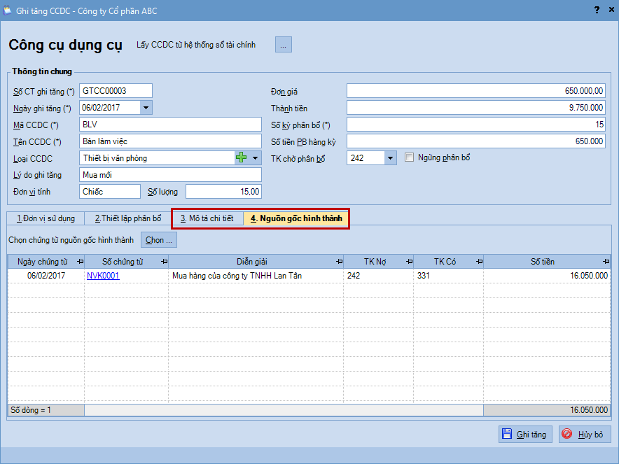 Lưu ý: Trường hợp muốn quản lý các bộ phận cấu thành nên CCDC hoặc chọn các chứng từ liên quan đến việc ghi tăng CCDC, cần khai báo lần lượt từng CCDC trên chứng từ Ghi tăng CCDC (vào phân hệ Công cụ dụng cụ, chọn Ghi tăng, sau đó khai báo thông tin trên tab Mô tả chi tiết và Nguồn gốc hình thành.)