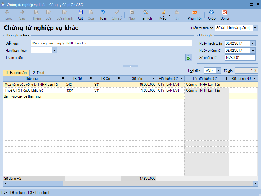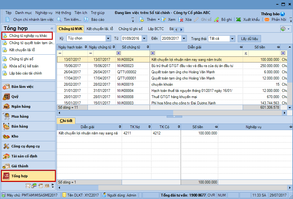 3.1. Trường hợp doanh nghiệp không có nhu cầu quản lý CCDC như một mã VTHHBước 1: Vào phân hệ Tổng hợp, chọn Chứng từ nghiệp vụ khác (hoặc vào tab Chứng từ NVK, nhấn Thêm\Chứng từ nghiệp vụ khác). (Tùy thuộc vào phương thức thanh toán mà nghiệp vụ này sẽ được thực hiện trên phân hệ Quỹ, Ngân hàng hoặc Tổng hợp).