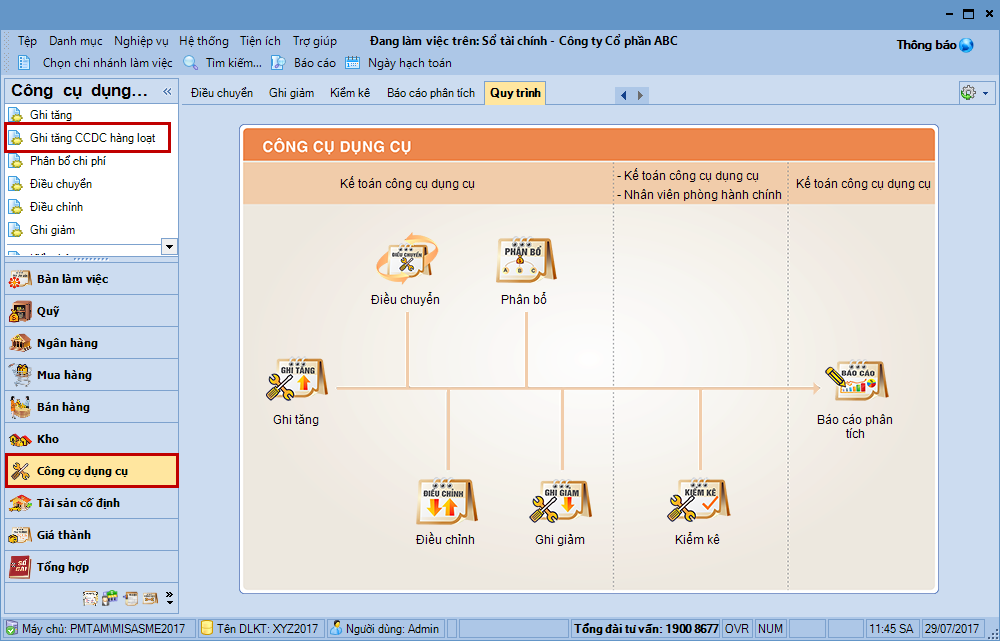 Bước 2: Vào phân hệ Công cụ dụng cụ, chọn Ghi tăng CCDC hàng loạt (hoặc vào menu Nghiệp vụ\Công cụ dụng cụ\Ghi tăng CCDC hàng loạt).