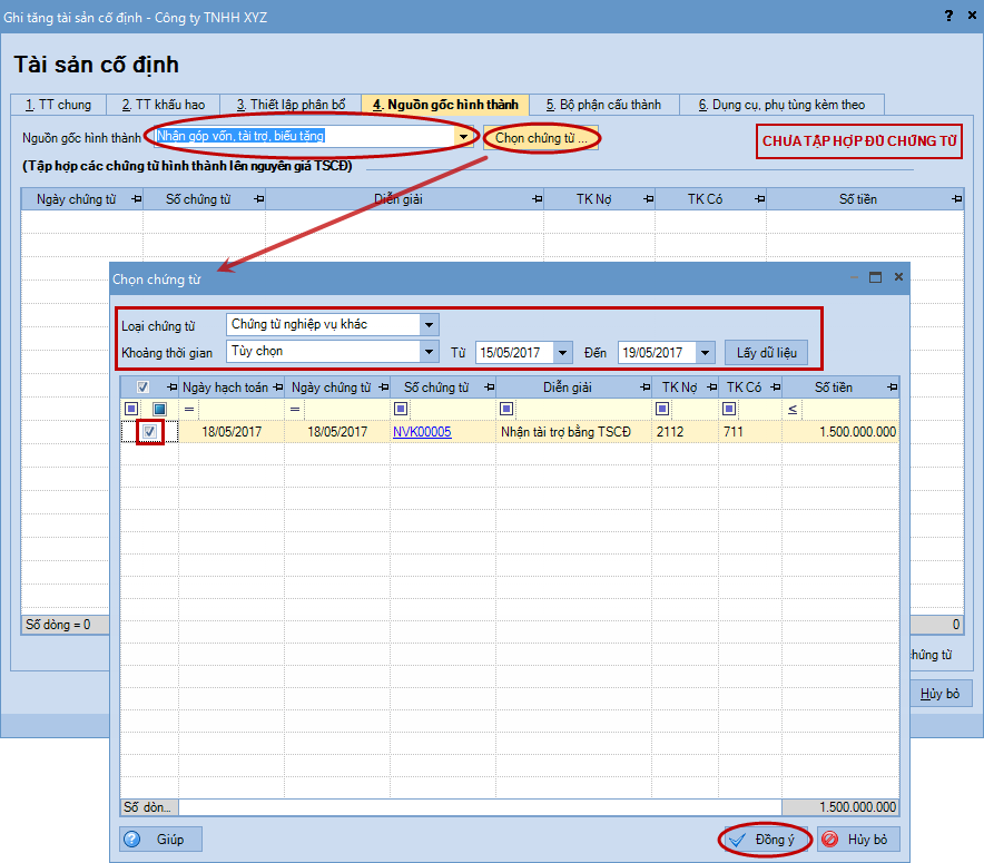 Lưu ý: Tại tab Nguồn gốc hình thành, kế toán sẽ chọn nguồn gốc hình thành là Nhận góp vốn, tài trợ, biếu tặng. Đồng thời tập hợp các chứng từ hình thành nên nguyên giá TSCĐ.