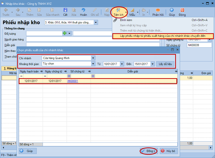 Bước 4: Chọn phiếu xuất của chi nhánh khác, sau đó Đồng ý.
