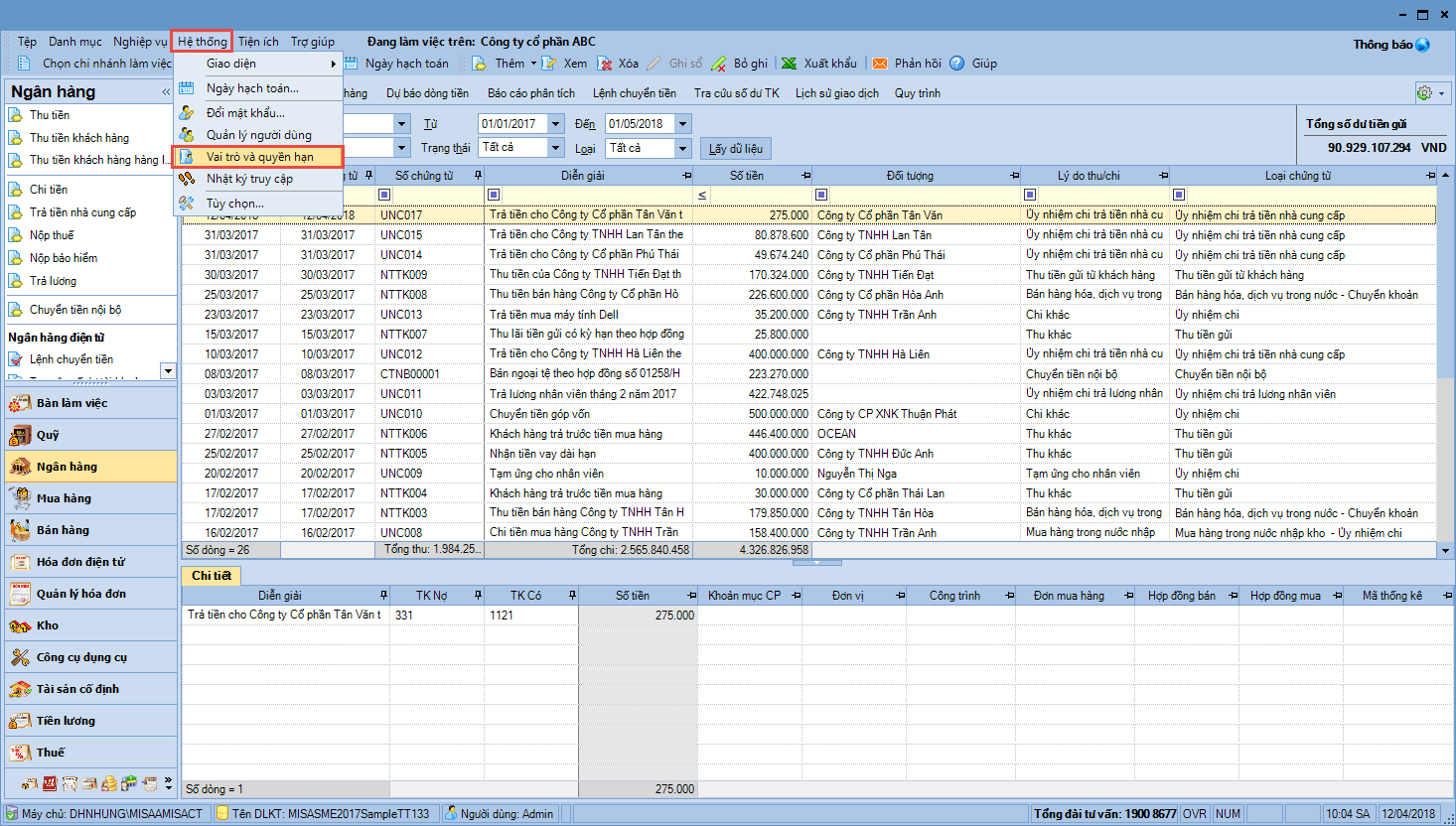 - Bước 1. Vào menu Hệ thống\Vai trò quyền hạn