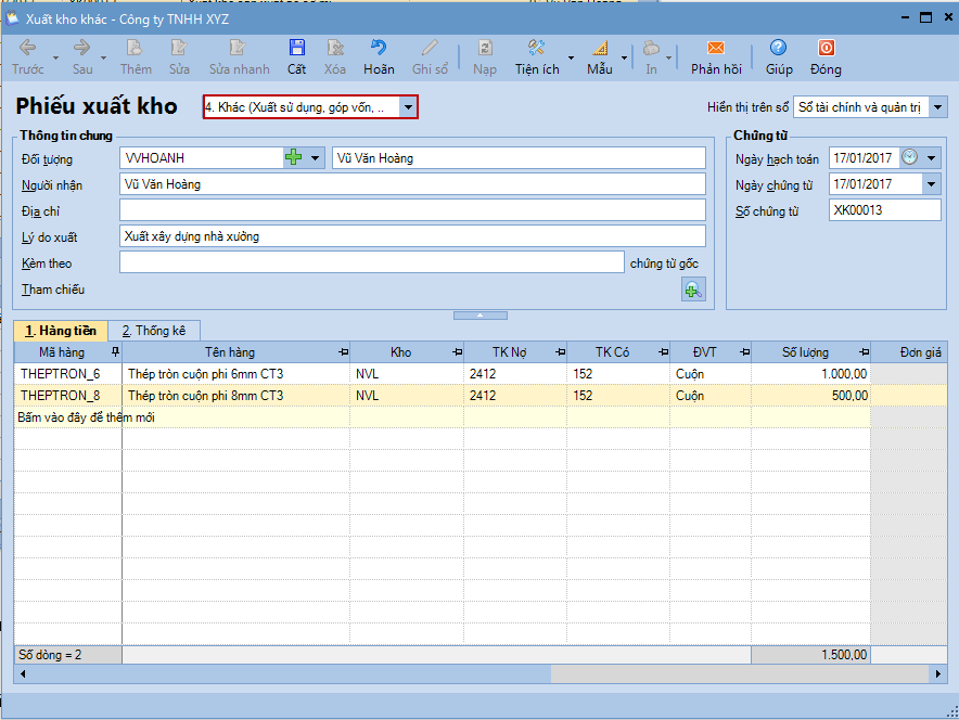 Mục đích: Hướng dẫn lập phiếu xuất kho ghi nhận việc xuất nguyên vật liệu, công cụ dụng cụ phục vụ cho hoạt động đầu tư xây dựng cơ bản hoặc sửa chữa lớn tài sản cố định.