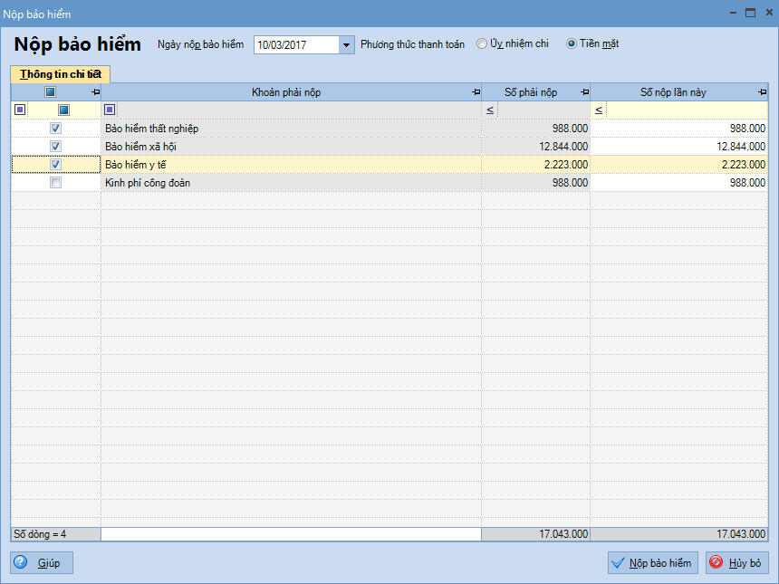 Mục đích: Bài viết này hướng dẫn chi tiết quy trình kế toán thực hiện nghiệp vụ nộp các khoản bảo hiểm xã hội, y tế, thất nghiệp và kinh phí công đoàn cho nhân viên bằng tiền mặt trên phần mềm kế toán.