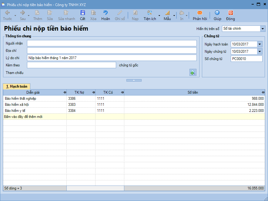 Lưu ý: Trường hợp Thủ quỹ có tham gia sử dụng phần mềm, sau khi phiếu chi nộp các khoản bảo hiểm được lập, chương trình sẽ tự động sinh ra phiếu chi trên tab Đề nghị thu, chi của Thủ quỹ. Thủ quỹ sẽ thực hiện ghi sổ phiếu chi vào sổ quỹ.