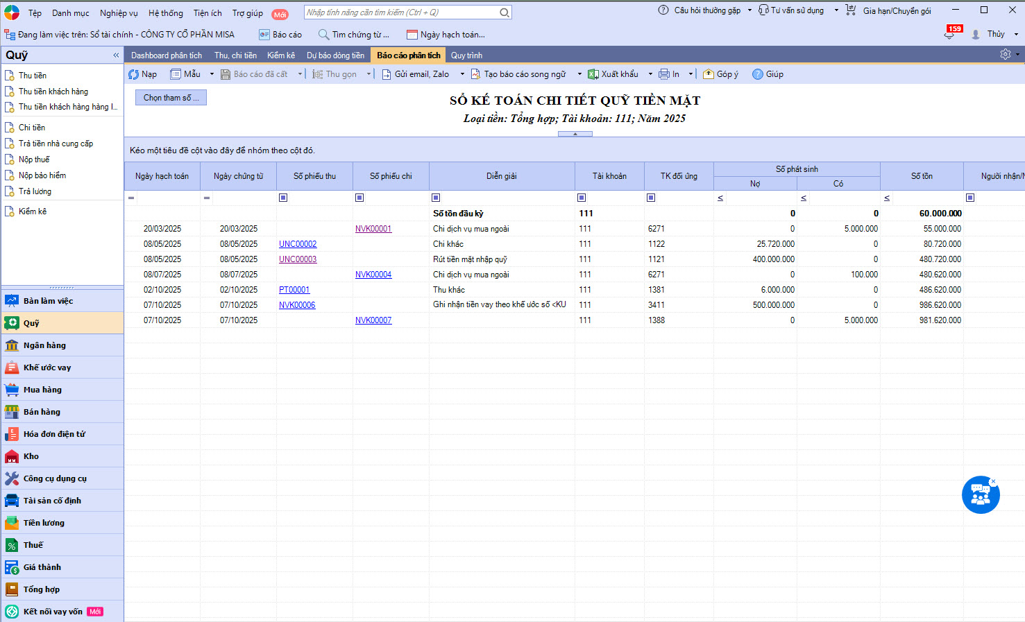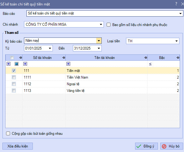 Bước 3: Nhấn Đồng ý để xem Sổ chi tiết tiền mặt.
